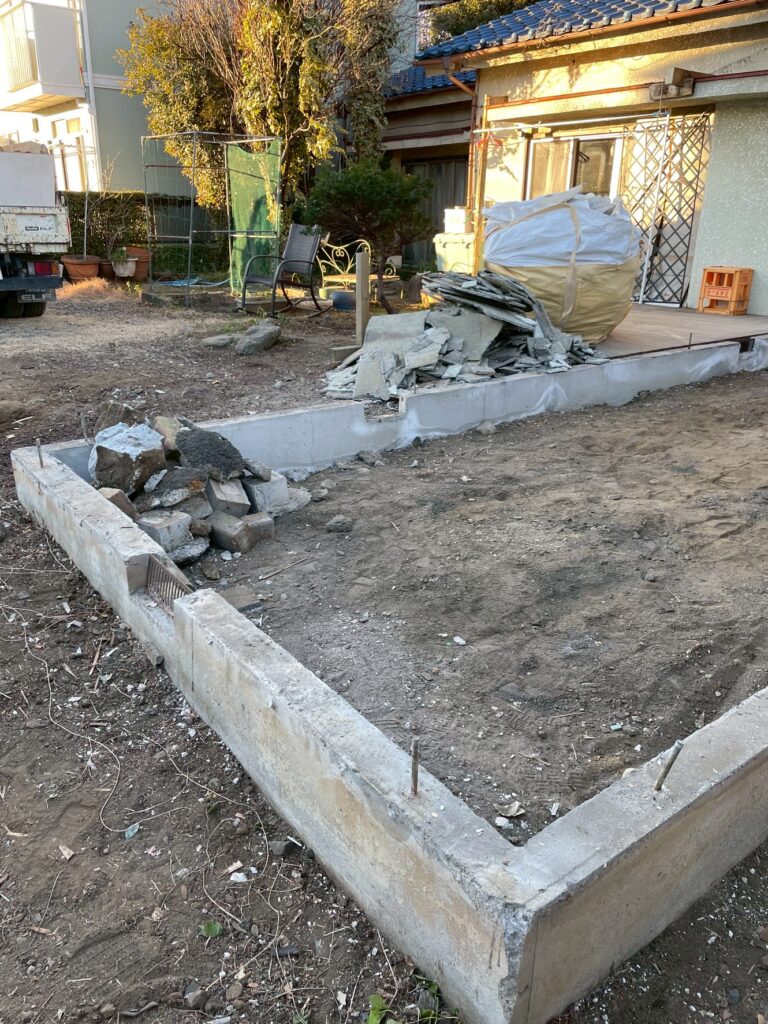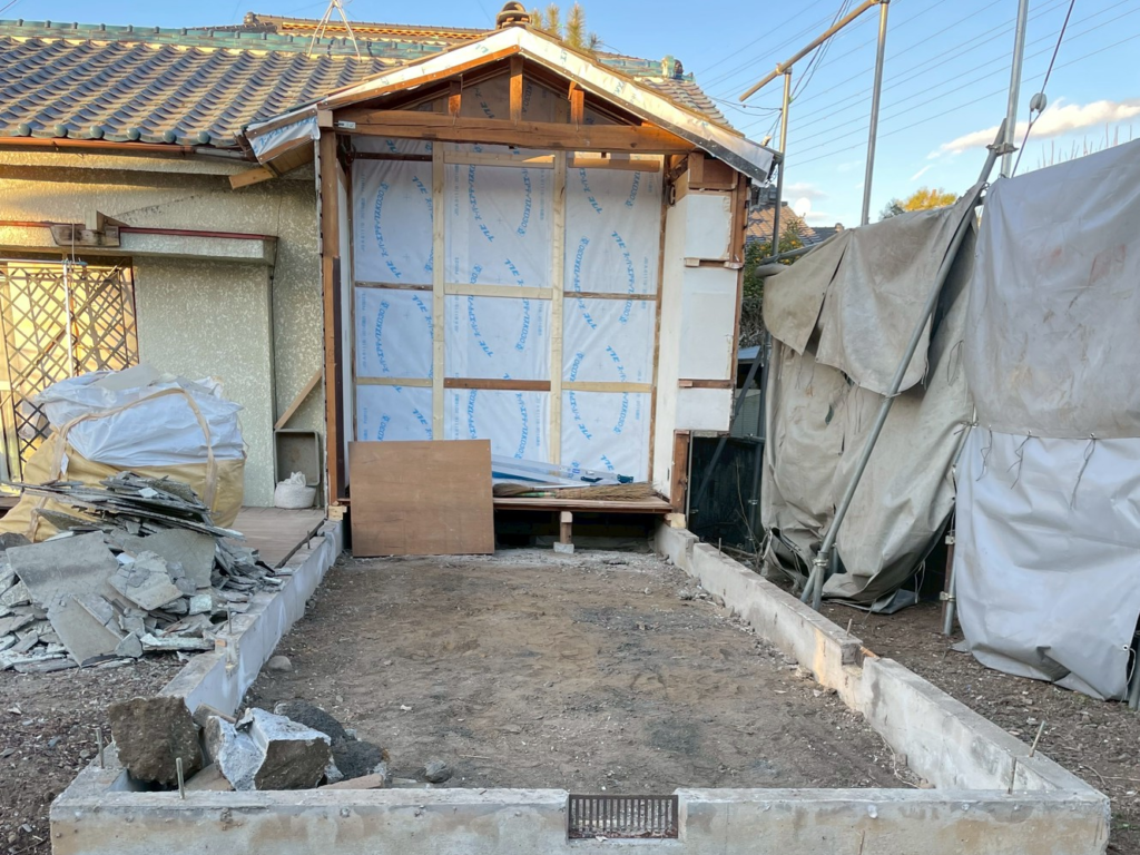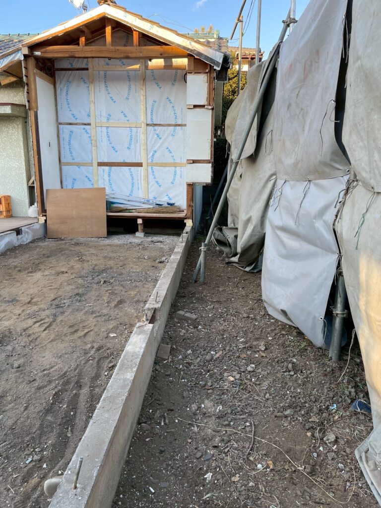 これにはお施主様の明確な目的がありまして、まず家の一部を解体し、庭と合わせたスペースに「新築」を建てます。その間、お施主様は残した方の家でそのまま生活を続けられるので、仮住まいを用意する必要がありません。